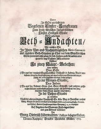Die 1715 bei Wendelin Müller in Neuruppin gedruckte Schrift enthält Texte für die vom Konvent des evangelischen Damenstifts Heiligengrabe täglich gehaltenen Gebetsstunden.